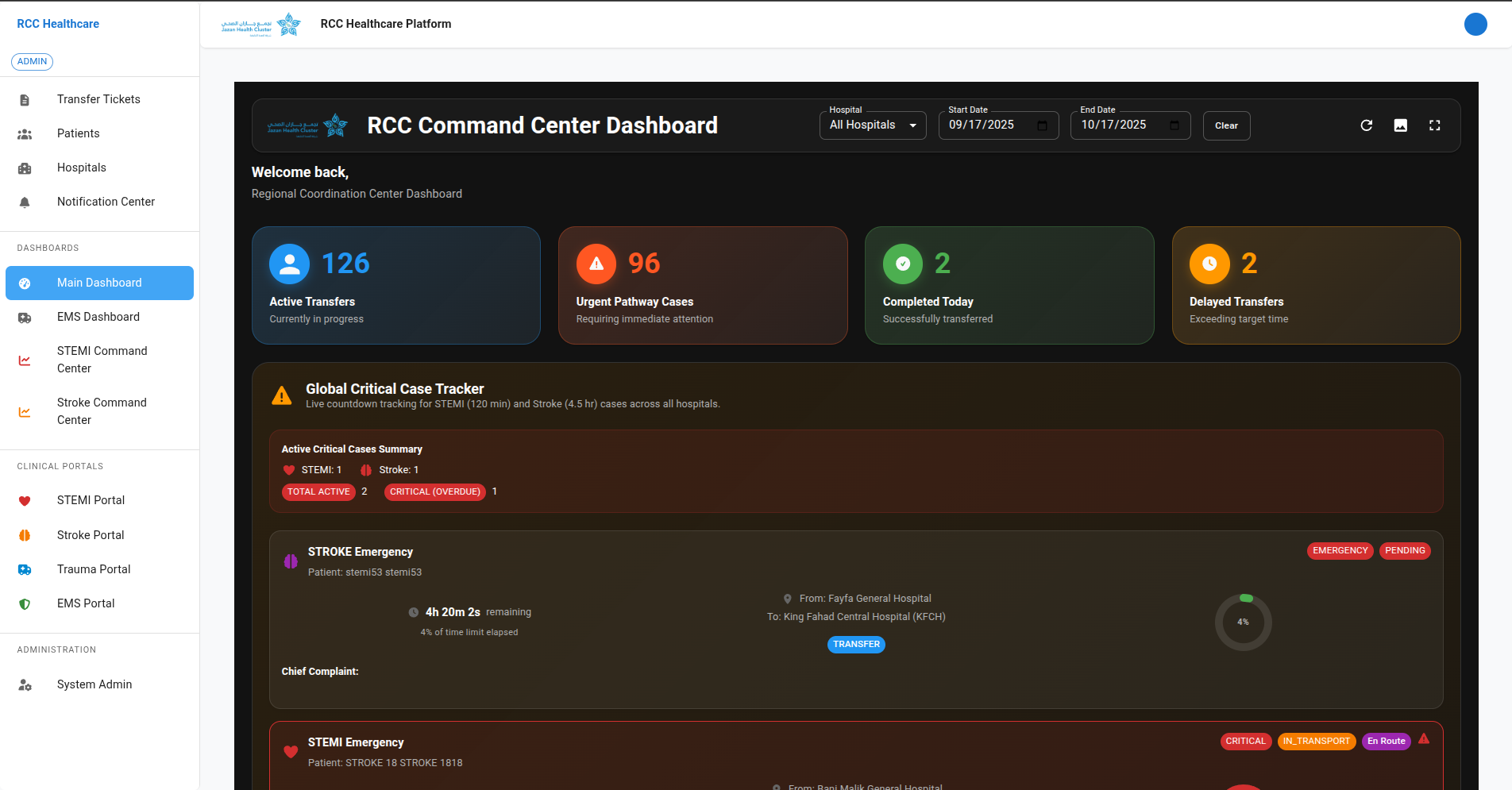 A government healthcare command center serving as the central coordination system for 26 hospitals in the Jazan region. It combines real-time WebSocket dashboards, STEMI/Stroke/Trauma clinical portals, intelligent triage prioritization, and KPI compliance tracking for Ministry stakeholders.